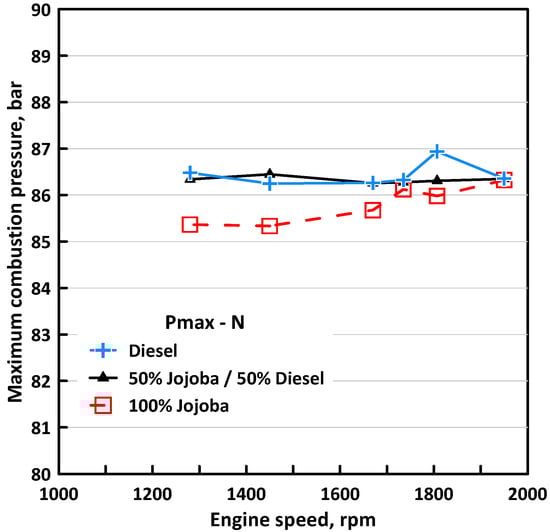 Effect of engine speed on the maximum combustion pressure for three fuels used.