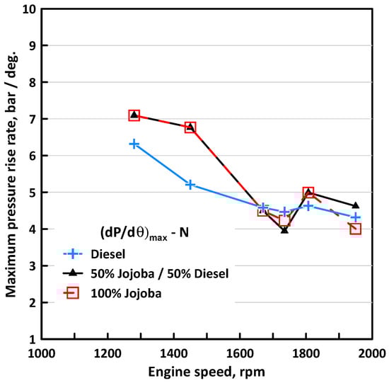 Effect of engine speed on the maximum combustion pressure rise rate for the three fuels used.