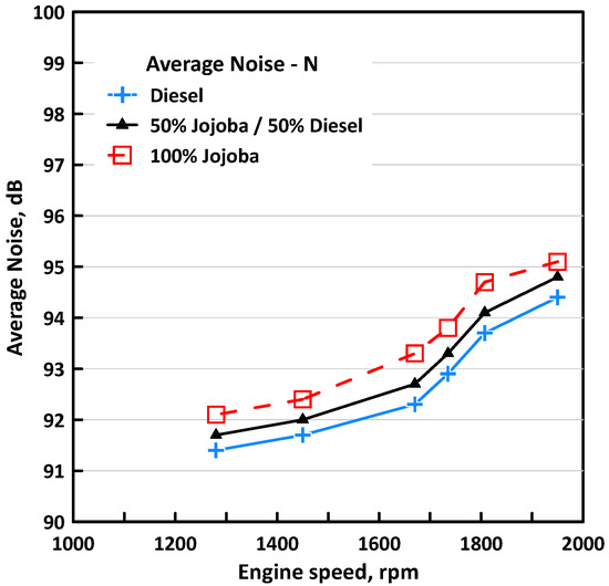 External noise and sound pressure level produced from the engine as measured by the two sensors used are shown in Figure 13 and Figure 14. Figure 13 shows the external noise as measured by the average noise meter with the engine speeds for the three fuels used. It may be seen from the figure that the Jojoba fuel case produced slightly higher external average noise at all engine speeds. This is followed by the 50/50 blend, and the diesel case produced the least noise. The difference between the noise for the Jojoba case and diesel case did not exceed 1 dB, as seen in the figure, which does not represent a big difference. One can conclude that using Jojoba fuel did not increase the noise much. It is well known that the external noise has three sources of mechanical noise of gears, shafts, valves, and other mechanical reciprocating and rotating parts. The second source of noise is the fluid mechanics noise due to the flow in the intake and exhaust ports as well as the flow of high-pressure fuel to the fuel injector as well as the flow behavior of the fuel. The third source for noise is from the combustion process itself as the high pressure rise rate converts to external noise and vibration of the engine block. The combustion noise appears to be higher for Jojoba, as shown in Figure 12, and the viscosity of Jojoba is much higher than that for diesel; viscosity, by definition, is the resistance to flow, which produces more resistance to flow on the injection pump and the high-pressure line, and this seems to produce more flow noise, assuming the mechanical sources of noise stay the same for the two fuels at the same engine speed. So, the external noise emitted from the engine as measured by the average noise meter appears to be higher for Jojoba oil than the case for the diesel fuel. This explains the trend in Figure 13 at all engine speeds. Figure 14 depicts the maximum noise as obtained from the ensemble averaged cycle of noise signal as collected from the microphone sensor over the many cycles collected. It may be also seen—similar to Figure 13 and except for the lowest speed tested—that the maximum noise generated was higher for Jojoba (compared with pure diesel) at most engine speeds tested. The values of the maximum noise found in Figure 14 are higher than the values obtained from Figure 13, as these represent the maximum noise detected over the complete engine cycle; it fluctuates during the same cycle.