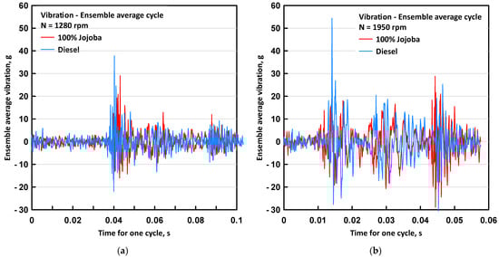 Ensemble-averaged vibration cycle at two engine speeds of (a) 1280 rpm and (b) 1950 rpm for the two fuels used.