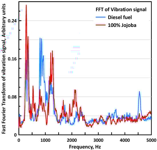 Figure 15, Figure 16 and Figure 17 illustrate the vibration behavior of the engine for Jojoba fuel as compared with pure diesel. Figure 15 shows the ensemble-averaged cycle for the five-hundred cycles collected for repeated engine cycles. The figure illustrates the time-domain data for two engine speeds of 1280 and 1950 rpm. Figure 16 shows the maximum vibration value at each engine speed for the ensemble-averaged cycle for the two fuels. It may be seen that the vibration produced for the Jojoba fuel was less than the vibration measured for diesel fuel case at all engine speeds. This seems to be good news for the Jojoba candidate. For example, at 1800 rpm engine speed, the maximum vibration magnitude for diesel fuel case was about 46.5 g while it was about 37 g for the Jojoba fuel case. These are the maximum vibration value recorded over the engine cycle. As seen in Figure 15, that the vibration signal has different peaks, e.g., one for maximum pressure rise rate associated with combustion process, one for intake valve opening/closure, and another for exhaust valve opening/closure. To explain the low vibration values in case of the Jojoba fuel case, Figure 17 shows the frequency domain of the vibration signal. It may be seen from Figure 17 that although the vibration signal for Jojoba case has higher amplitudes than the values for diesel case, the peaks (or more vibration energy) for Jojoba occurred at much lower frequency, i.e., the engine in that case would have been vibrating with less frequency of vibration (slower in motion) than the case of the pure diesel case. This may have been collected by the vibration sensor to produce lower vibration. It may be interesting also here to point out that the reduced vibration produced for the case of raw Jojoba may be due to the low maximum pressure measured in that case; check Figure 11 for the three cases of diesel, raw Jojoba, and 50/50 blend. The maximum pressure in the case of Jojoba is lower that that for diesel and this may be the reason why the vibration is lower.