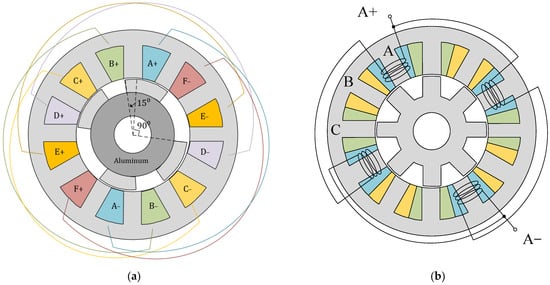 This section presents the basic structure and the operation method of the proposed SRM. Figure 1a shows the structure of the proposed SRM, which is a six-phase SRM with a misaligned rotor segment. Two of the rotor segments are misaligned by 15 degrees. With the misaligned rotor segments, the proposed SRM has two phases working simultaneously. It means one out of three phases is working when it is running. The conventional SRM in Figure 1b is the reference SRM, compared to the proposed SRM.