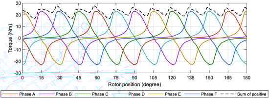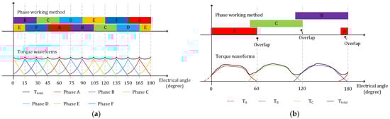 Figure 4b presents the working method of the conventional three phases SRM [24,25]. Figure 4a shows the working method of the proposed SRM and illustrates the method to reduce the torque ripple. Where the TA, TB, TC, TD, TE, TF and Ttotal means the positive torque of phase A, B, C, D, E, F and the total positive torque, respectively. With the 15-degree misalignment and two phases working simultaneously, the torque of each phase can be summed to produce the total output torque and reduce the torque ripple. Furthermore, as there are two phases working together, the power density of the proposed SRM can be doubled compared to the conventional six-phase SRM.