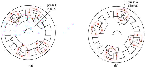 Magnetic fields of the proposed SRM: (a) magnetic fields when the previous phase of phase A is aligned; (b) magnetic fields when phase A is aligned.