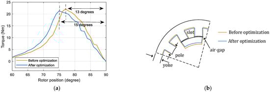 Table 2 lists the details of the optimization method. The objective is to minimize the distance between the maximum torque point and the 75-degree position. When the maximum torque point is fixed to the 75-degree position, the distance between the maximum torque point and the zero-torque point will be 15 degrees. The torque waveforms of the next phase are shifted by 15 degrees. As a result, the maximum torque point of the present phase will be in line with the zero-torque point of the next phase. Therefore, the torque ripple of the proposed SRM is reduced as illustrated in Figure 4. The degree-of-freedom is the width of the stator poles, and the constraint is to keep the slot area constant for the windings. The optimization algorithm used for this problem is the golden section search and parabolic interpolation algorithm [26,27].