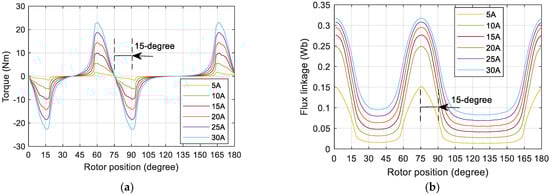 FEM simulation static torque and flux linkage profiles of the proposed SRM: (a) the static torque profiles; (b) the static flux linkage profiles.