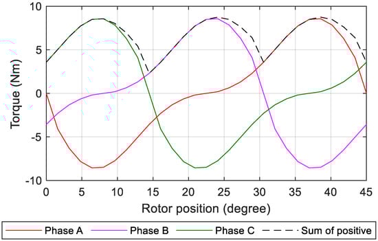 Figure 10 presents the static performance from the FEM simulation of the proposed SRM. The FEM simulation is performed with the maximum current 35 A. The dashed line in Figure 10 shows the sum of the positive torques of each phase. It explains the method of the proposed SRM to reduce the torque ripple. Once the phases work in the sequence displayed in Figure 4, the output torque ripple will be reduced. Figure 11 displays the FEM simulation results of the conventional SRM with 35 A current. The average value of the static torque for the proposed SRM and the conventional SRM are 23.9 Nm and 6.6 Nm, respectively, as listed in Table 1. The difference is from the inductance difference of the two SRMs.