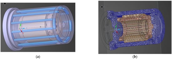 Cooling jacket and the FEM analysis: (a) the CAD model of the cooling jacket and SRM; (b) the mesh distribution for the FEM simulation.