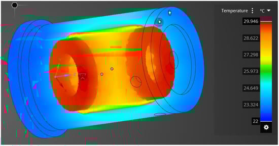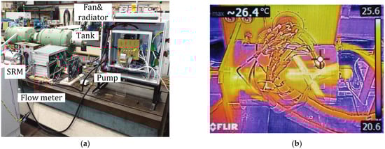 Figure 15a presents the setup of the cooling system. Figure 15b illustrates the measured thermal results. From a hole for the cable terminal on the water jacket, the temperature of the stator can be observed. It is 26.4 °C as shown in Figure 15b.