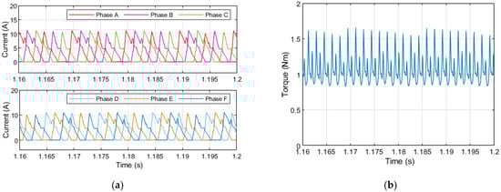 MATLAB/Simulink simulation results at 3000 rpm: (a) current waveforms. (top) Phase A, B and C, (bottom) Phase D, E and F; (b) torque waveform.