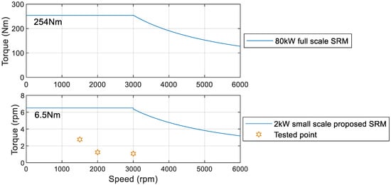 Figure 20 presents the torque-speed specification for the 80 kW full-scale SRM and the 2 kW small-scale proposed SRM. For both SRMs, the rated speeds are 3000 rpm, and the maximum speeds are 6000 rpm. For the full-scale SRM, the rated torque is 254 Nm. The rated torque is 6.5 Nm for the small-scale SRM. In Figure 20, the tested points for this paper are marked.