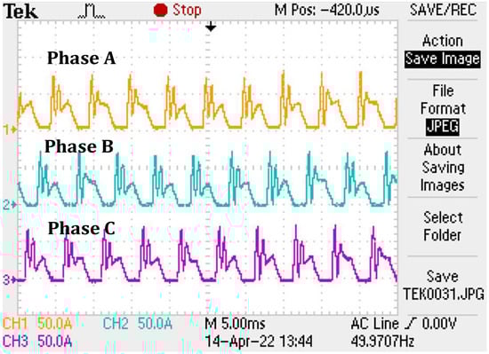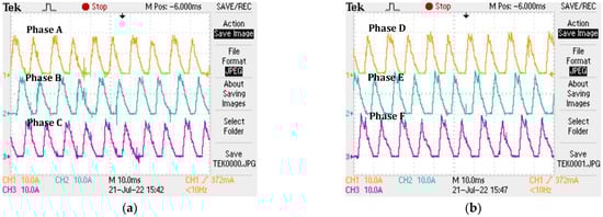 Figure 21a shows the proposed SRM experimental results of the current waveforms for phase A, B and C at a speed of 1500 rpm with load. Figure 21b shows the proposed SRM experimental current waveforms for phases D, E and F at 1500 rpm with load.