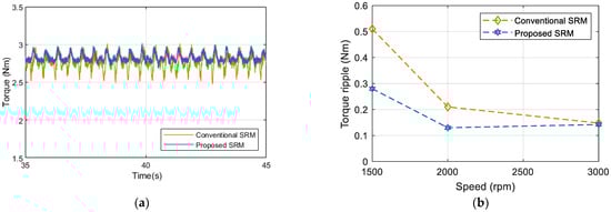 Figure 23a shows the experimental result of the torque waveforms measured from the sensor on the shaft. It illustrates that the proposed SRM reduces the torque ripple by 45% at 1500 rpm compared to the conventional SRM. Figure 23b displays the torque ripple comparison from the sensor on the shaft for different speed values. It shows that the proposed SRM obtains lower torque ripple measured from the sensor on the shaft at different speeds compared to the conventional SRM.
