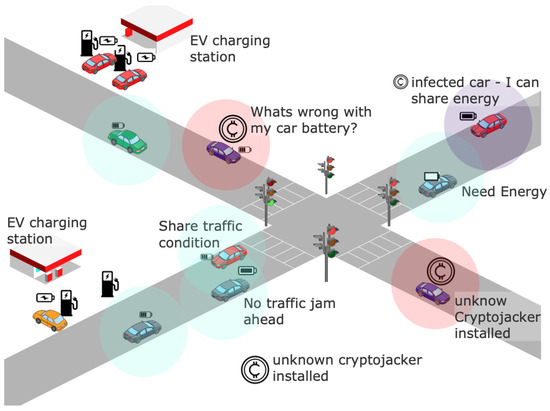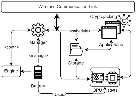 The modules of the proposed framework are shown in Figure 2. The manager module is responsible for assigning resources to the applications, including storage and GPU/CPU. The storage module is used for data persistence. The EV battery is utilized by the engine module as well as for software execution. The cryptojacked application executes and mines hashes which are offloaded to the hackers’ system. The framework allows EVs to communicate with nearby charging stations through dedicated short-range communication. This communication is used to identify available charging slots. Here, the charging stations act as passive entities that can share available slots information on request. The energy wasted due to cryptomining is estimated in terms of hashes computed. Each EV has a built-in GPU which is utilized to compute the hashes through the mining process. The framework facilitates the simulation study by allowing the user to vary the number of crypto-infected vehicles. The infection rate must be defined in the framework configuration file along with other parameters, such as mining rate, EV arrival rate (), etc.