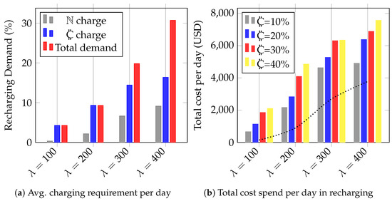 ryptojacking is occurring. In this figure, consider the case where . Initially, the charging rate noted for the normal case is approximately 9.14 (the gray bar), which increases to 16.38 when cryptojacking is employed (the blue bar). The rate difference is computed as the ratio of the difference to the new value i.e., . Therefore, 44% more EVs request a recharge. Further, when the arrival rate increases, the recharge request rejection rate at the nearby charging stations swells to 46%.