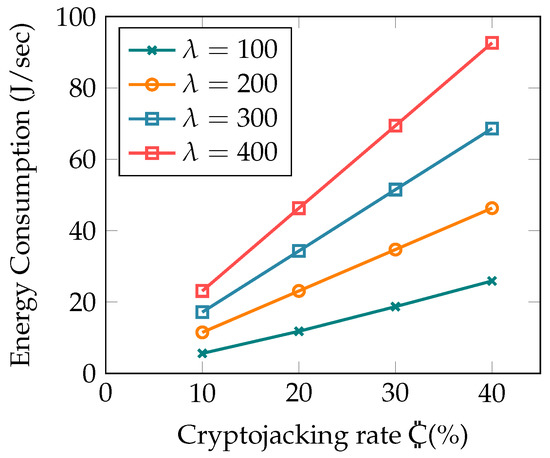 The main purpose of cryptojacking is to compute hashes using the energy and compute resources of electric vehicles. This waste of energy has a direct consequence on the charging stations, thus causing a congested situation at charging stations. Figure 5 shows the energy consumption due to cryptojacking with variable EVs arrival rate in the simulation. Here, we assumed that every EV has a graphical processing unit able to compute a million hashes per second. The GPU processing capability and energy consumed per million hashes are listed in Table 2. The figure shows the increasing trend in all cases, with = 400, and 40% initial crypto-infected vehicles causing an overall significant energy consumption. Thus, with more energy consumption due to cryptomining, more recharging requests are generated on nearby stations.