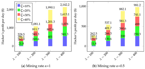 Figure 7 shows the hacker’s profit per day with a variable arrival rate. The profit reported in Figure 7a uses = 1, whereas Figure 7b shows the hacker’s profit with value equal to 0.5. Infected vehicles with cryptojacking executing at a maximum mining rate of = 1 provides the maximum earnings. With 40% cryptojacked vehicles, and = 100, the earning reported is USD 528.5; which reaches USD 2142.2 at = 400. Similarly, the profit value reduces to USD 262.5 at = 100 with = 0.5. Thus, the tradeoff in profit is the stealth operation, which can help the malware to stay undetected for a longer period of time.