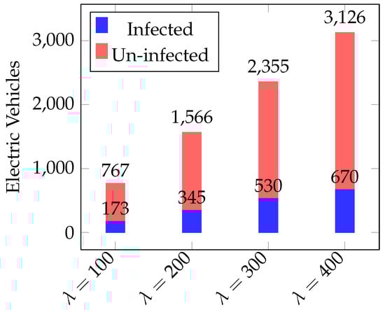 Figure 8 shows the ratio of infected and uninfected vehicles. Initially, no vehicle is crypto-infected, at = 100, 173 vehicles are infected; whereas in a more congested environment with = 400, 670 vehicles are infected. It is worth noting that this high rate of spread depicts the infection through just a single compromised charging station. This can increase manyfold if charging stations decide to collude to infect EVs.