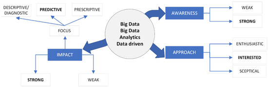 Other respondents tend to propagandize Big Data, considering that Big Data and its analytics offer a lot of opportunities. They are part of the enthusiastic group–mostly managers with an IT background that are trying to push the adoption of these new technologies. As two representatives of this group indicated, “I am very interested in new technologies and their potential business value–especially Big Data and Artificial Intelligence-and I promote them throughout my company” and “The ability to exploit big data properly could significantly change the way we do business.” The enthusiastic group is represented mostly by those that overrate new technologies and use visionary language to express their potential benefits. These attitudes appear in several responses: “Big Data will revolutionize the way we do business” and “Big Data will dramatically change our business processes and operations in the near future”.