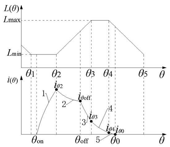 As shown in Figure 1, the upper part is the linear inductance curve of one-phase winding of stator, the lower part is the current curve of one-phase winding under APC control mode, the horizontal axis is the position angle of rotor θ, and the longitudinal axis is inductance L(θ) and current i(θ). Lmax is the maximum inductance value of one-phase winding, Lmin is the minimum inductance value of one-phase winding, θon is the turn-on angle, θoff is the turn-off angle, iθ2, iθoff, iθ3, iθ4 and iθ0 at the round black spot, respectively, represent the current when the rotor position angle θ is θ2, θoff, θ3, θ4 and θ0. According to the shape of the linear inductance curve, the rotor position is divided into different working sections: the minimum inductance section [θ1, θ2], inductance rising range [θ2, θ3], maximum inductance section [θ3, θ4], inductance drop range [θ4, θ5]. Curve 1 in the current curve is the current in section [θon, θ2] after the turn-on angle, curve 2 is the current when the rotor position angle θ is in the [θ2, θoff] range, curve 3 is the current when rotor position angle θ is in section [θoff, θ3], curve 4 is the current when the rotor position angle θ is in section [θ3, θ4], curve 5 is the current when rotor position angle θ is in section [θ4, θ0], and θ0 is the rotor position angle when the current drops to zero.