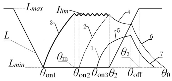 Figure 3 shows the winding current waveform when the turn-off angle θoff is the same and the turn-on angle θon is different, in which θon1, θon2, and θon3 are three different turn-on angles, θoff is the turn-off angle, and θm is the rotor position angle where the current of curve 3 reaches Ilim, L is the inductance curve, Lmax is the maximum inductance, and Lmin is the minimum inductance. Assume that the target current of the winding at θ2 is Ilim, the curves 1 to 3 are the current waveforms of the winding in the minimum inductance interval at different turn-on angles, and the curves 4 and 5 are the current waveforms of the winding in the interval [θ2, θoff], respectively.