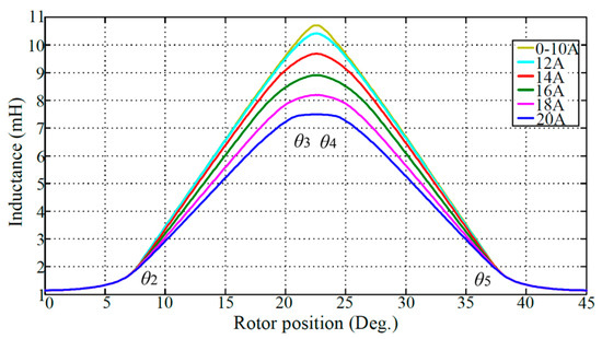 Equation (2) shows that the current in the two inductance sections [θ2, θ3] and [θ4, θ5] can generate torque, the current in interval [θ2, θ3] can produce output driving torque, [θ2, θ3] is called the effective working interval. The current has no torque output in the minimum inductance section [θ1, θ2] and the maximum inductance section [θ3, θ4].