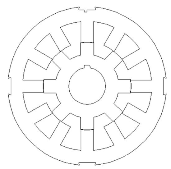 Figure 7 shows the stator and rotor cogging structure of the tested three-phase 12/8 pole SRM. The number of stator teeth is 12 and the number of rotor teeth is 8. Along the circumference of the air gap, the mechanical angle occupied by the stator teeth is 16°, the mechanical angle occupied by the stator slot is 14°, the mechanical angle occupied by the rotor teeth is 18°, and the mechanical angle occupied by the rotor slot is 27°.