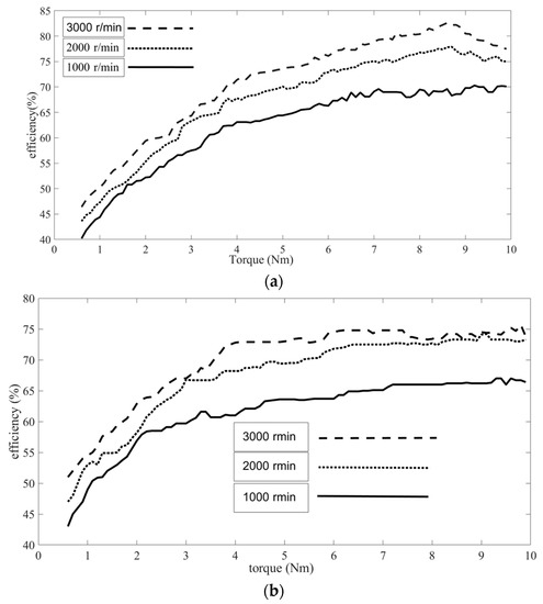Control the motor speed at 1000 r/min, 2000 r/min and 3000 r/min, respectively, through the controller, gradually increase the resistance torque of the dynamometer to 8 N·m, and test the efficiency of the system at different speeds according to the set turn-off angle. Figure 9a shows the system efficiency when the turn-off angle is 108°, and Figure 9b shows the system efficiency when the turn-off angle is 129°. It can be seen that although the turn-off angle is different, the efficiency of the system increases with the increase in speed; on the other hand, for different motor speeds, the efficiency of the system increases with the increase in output power, which is in line with the general law of motor speed regulation with load, and also shows that the control strategy of turn-off angle is feasible.