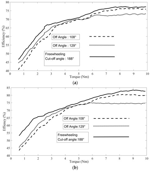 Figure 10 shows the efficiency test comparison curve with the speed of 2000 r/min and 3000 r/min, respectively, the off angle of 108°, 129° and the fixed freewheeling angle of 188°. It can be seen that at different speeds, the efficiency of the fixed freewheeling angle of 188° is the highest, which explains the effectiveness of the shut-off angle control based on the optimal freewheeling angle proposed in the text.