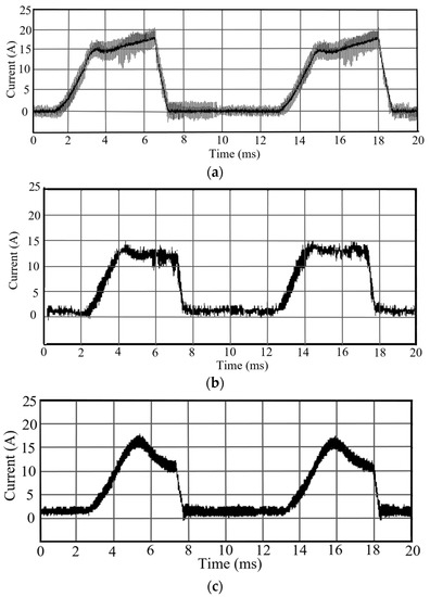 Figure 11 shows the current waveforms when the motor speed is 800 r/min, the load torque is 6 N∙m, and the turn-on angles are 20°, 0°, and −20°, respectively. Figure 11a has a larger turn-on angle, the slope of the current in [θ2, θoff] is positive, and the average current value in the interval is about 16 A. Figure 11b shows the current waveform with the turn-on angle of 0, the slope of the current in [θ2, θoff] interval is approximately 0, and the average value of the current in this interval is about 12.5 A. Figure 11c shows the current waveform with the turn-on angle of −22°. The turn-on angle is small, the slope of the current in [θ2, θoff] interval is less than 0, and the average value of the current in this interval is about 13 A. Figure 11 shows that the magnitude of the turn-on angle determines the slope of the current in the interval [θ2, θoff]. As the turn-on angle decreases, the current slope changes from positive to negative. Giving the same load torque, if the turn-on angle is larger, the current is larger. The average current value with 0 and 20° turn-on angle is not much different. Therefore, it is beneficial that the slope of the current in the [θ2, θoff] interval is less than 0.