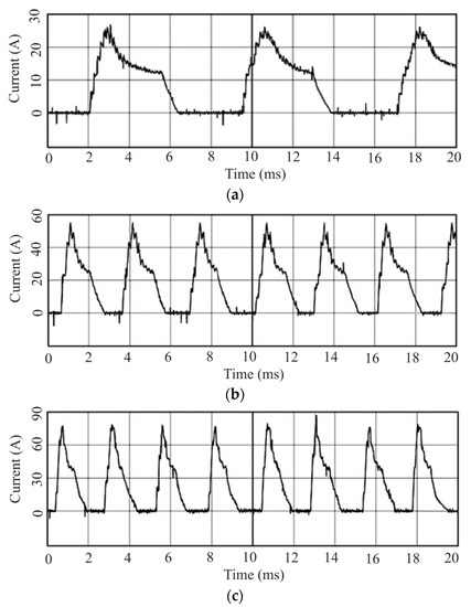 Figure 12 shows the current waveform at different speeds, and the turn-off angle θoff is set to 115°; the turn-on angle θoff controls according to the algorithm given in Equations (12)–(14). The σ of Equation (12) is set to 50% of the current peak, the load torque of the dynamometer is set to 8 Nm, and the traditional PI algorithm is used for speed control. Figure 12a shows the current waveform at the speed of 1000 r/min, Figure 12b shows the current waveform at the speed of 2000 r/min, and Figure 12c shows the current waveform at the speed of 3000 r/min.