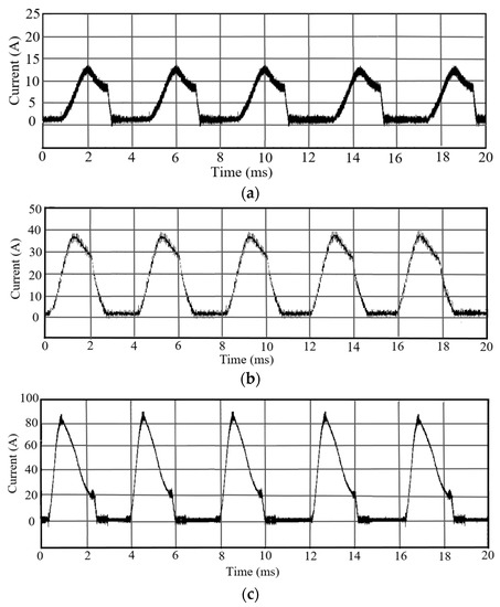 Current waveforms with same rotational speed and different load torques. (a) Current waveform with 4 N∙m load torque. (b) Current waveform with 8 N∙m load torque. (c) Current waveform with 12 N∙m load torque.