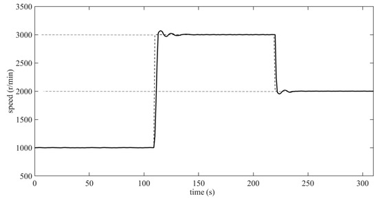 Set the dynamometer to apply a torque of 8 Nm, set σ as 2 A. The motor control strategy shown in Figure 5 is realized, and the tracking performance of the control algorithm is tested. The parameters of the model free adaptive control algorithm are set as: , ε = 0.005, μ = 1, η = 1, ρ = 0.5, λ = 1.0. The tracking curve of speed is shown in Figure 14. First, make the motor run at a speed of 1000 r/min, then set the target speed to 3000 r/min, and the motor can complete the tracking of step speed regulation. Then, set the target speed to 2000 r/min, and the motor can also complete the speed regulation control of speed tracking.