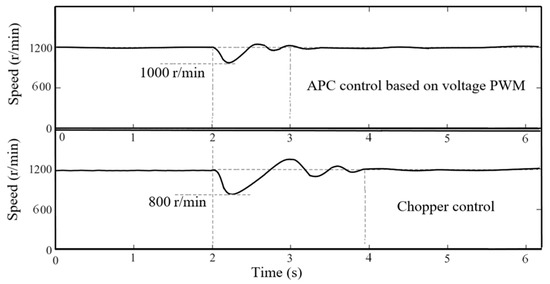 Figure 16 is a graph of the speed change corresponding to the two control methods in Figure 15. The upper part of Figure 16 is the speed change curve of the APC speed regulation control method, and the lower part is the speed change curve of the current chopping control speed regulation method. It can be seen that the APC speed control method above has a smaller speed reduction (200 r/min) and a shorter speed recovery time (1 s), while the current chopping speed control method below has a larger speed drop (400 r/min), and the speed longer recovery time (2 s). It also shows that the control strategy proposed in this paper has advantages for a sudden large-pulse load.