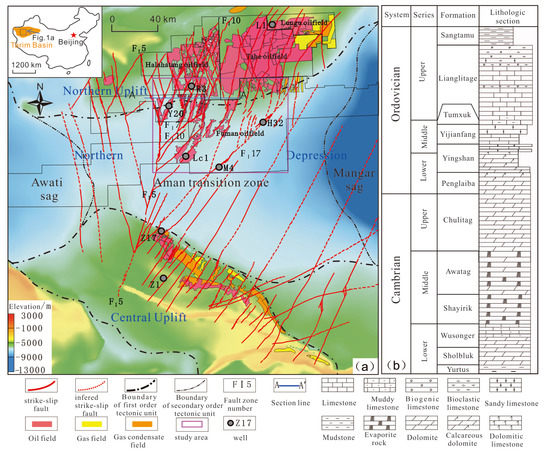(a) The strike-slip fault system in the Ordovician carbonates (the figure at the top left corner showing the location of Figure 1a in the Tarim Basin) and (b) the Cambrian–Ordovician stratigraphic column in the Tarim Basin (the strike-slip fault zones are mapped by 3D seismic data [30], while the color base map showing the topography of the top of the Ordovician carbonate, the oil/gas distribution and the tectonic sketch are in accordance with reference [18]).