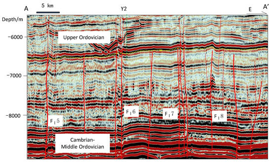 Recent studies show that the source rocks of the Lower Cambrian in the north depression are well developed and overlapped with the strike-slip faults in Aman Transition Zone [18,33]. Through the connection of the strike-slip faults, multiple oil-bearing plays formed in the Lower and Upper Cambrian, Lower Ordovician Penglaiba Formation and Yingshan Formation, and Middle Ordovician Yijianfang Formation and Upper Ordovician Lianglitage Formation, which comprise a strike-slip fault-controlled petroleum system [18,27] (Figure 1 and Figure 8). The Yingshan Formation and Yijianfang Formation at the top of the Ordovician carbonate are the main oil-bearing strata in Fuman Oilfield [19,25].