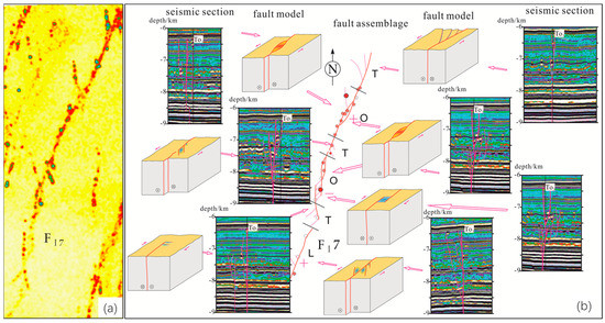 More than 10,000 km2 3D seismic surveys have been acquired in the study area. The prestack time migration seismic dataset in the Ordovician carbonates are used for structural mapping and seismic reservoir prediction [20,21]. The fault with vertical displacement more than 10 m could be identified from the seismic sections. However, the faults with small displacement are difficult to identify, and the fault terminal and linkage is hard to mapping by low-resolution seismic data in the ultra-deep subsurface. In this way, seismic attributes such as coherence, curvature, ant body and likelihood are used to map strike-slip fault [18,20,21], and fault segment modeling and the vertical throw along the fault strike are helpful for fault segment identification [34].
