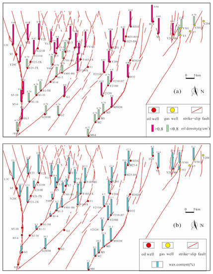 The density of surface crude oil varies in the range 0.77–0.88 g/cm3 (20 °C), and oil colloid-asphaltene varied at 0.2–19.8%, with the oil characterized by a combination of normal oil and condensate gas (Figure 4a). Crude oil viscosity is 0.89–9.78 mPa•s (50 °C); freezing point is 30–10 °C; average sulfur is 0–0.77%; variable wax content is 0.2–19.8% (Figure 4b). The oil density, wax content and other physical properties show an increasing trend from south to north and from east to west in the study area. There are quite different properties along the strike of the fault zone. The oil with a low density, i.e., less than 0.8 g/cm3, and a high gas/oil ratio (GOR) is generally condensate oil. Along the strike-slip fault zone, the oil density and wax content change regularly from south to north. For example, from well M4 in the south to well H32 in the north of fault FⅠ17, the crude oil density increases from 0.77 g/cm3 to 0.82 g/cm3, and the wax content increases from 7.5% to 11.8%. The crude oil has low density, low viscosity, minimal sulfur and high wax content oil along a fault zone, but some wells have oil with high density, high sulfur, and low wax content. Further, there are some irregular variations showing a sudden decrease or increase trend of oil properties in some strike-slip fault zones. These suggest that there is a different fluid property between the fault segments along a strike-slip fault zone, which resulted in the complexity of oil accumulation and alteration.
