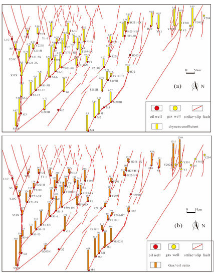 The gas components include CH4 (46.7–84.6%), CO2 (0.1–9.6%) and N2 (0.67–24.7%). The average gas density is 0.67–0.96 g/L. H2S varies in a large range of 0–15,482 ppm. The samples display dryness coefficient at 0.48–0.98%, and most of them present dissolved gas in the oil production wells. The dry gas coexists with normal oil with a density of up to 0.85 g/cm3 along a fault zone (Figure 5a). The GOR (gas/oil ratio) varies in the range 46–3405 m3/m3, with most less than 600 m3/m3 with high oil density (Figure 5b). With the increase in drying coefficient, nitrogen content decreases while the gas/oil ratio increases. There is generally lower nitrogen content, higher GOR and drying coefficient in the eastern and southern areas. Most of the natural gas samples show dry gas in the eastern area. In addition, the gas parameters vary greatly in the Ordovician reservoirs to show the coexistence of dry and wet gas along a fault zone.