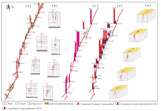 (a) The reservoir segmentation by seismic attribute of amplitude change rate; (b) different well reservoir models by reservoir description; (c) saturation/aromatics ratio; (d) oil production and (e) oil pool models along the strike-slip fault FⅠ7 in Fuman Oilfield.