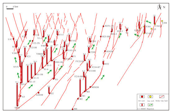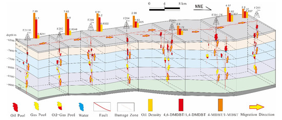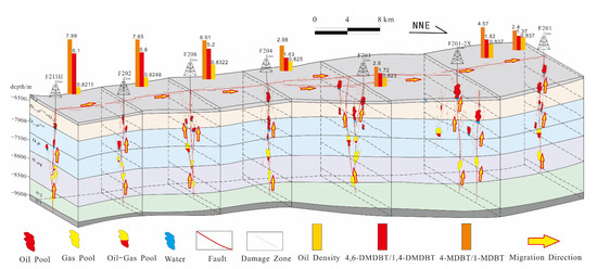 On the other hand, the 4-/1-MDBT values show a decreased trend from south to north along the fault strike (Figure 9). The decreased trend of 4-/1-DMDBT values revealed a lateral oil migration direction from south to north along a fault zone. This is consistent with the regional fluid potential from the southern depression to the northern uplift [16,29], and the varied trend of the oil property [4,5]. These trends of fluid properties and geochemical data are constrained along the fault zone, indicating a lateral oil migration direction along the fault zone. Further, the trends show that the oil migration at the Ordovician is closely related with the segmentation along the strike-slip fault strike. Taking FY2 fault zone as an example (Figure 10), the crude oil maturity parameters 4-/1-MDBT and 4,6-/1,4-MDBT show two distinct decreased segments from well F211H to F203 and from well F201-2x to F201, indicating two isolated segments for oil migration along the fault strike. Furthermore, most fault zones present variable fluid property and geochemical values along the fault segments (Figure 4, Figure 5 and Figure 9). These are in agreement with the segmentation of fault assemblage, reservoir and fluid property (Figure 4 and Figure 5). In addition, there are gradually varied fluid property and 4-/1-DMDBT values in the northeastern YK area. These revealed a gas lateral migration from east to west across the fault zones, rather than along a fault zone. This is possibly related to the intense Cenozoic gas cut in the eastern area [16,29]. It should be noted that the hydrocarbon enrichment is constrained by fault segmentation in oil migration and by forming isolated reservoir compartments by segmented heterogeneous reservoirs. This suggests that the fractured reservoirs in most wells are not through-going in different segments. During the period of stagnation of fault activity, fractures were filled and cemented completely [37], and the oil was constrained in localized connected fracture-reservoirs. In addition, the oilfield in a broad depression constrained the large-scale lateral oil/gas migration. This was also an important factor for the preservation of a large amount of oil reserves that formed in the Late Ordovician in the stable depression [27].