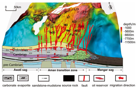 All wells penetrated the Ordovician strata in the Aman Transition zone, suggesting an absence of Middle-Upper Ordovician source rock in the depression [18], whereas the shale source rock at the base of the Lower Cambrian has been penetrated by well L1 [33]. The shale rocks have high TOC, more than 2%, and the thickness increases progressively more than 100 m from the uplift to the central Aman depression [18,33]. In this context, Fuman Oilfield is located in the center of the source rock at the Lower Cambrian. However, the major source rock is buried deep, more than 2000 m from the base of the Lower Cambrian to the top of the Ordovician carbonate, particularly of a set of evaporites more than 200 m in thickness [18,29]. Subsequently, the fault network is the dominant pathway for oil vertical migration through tight strata [18,29,33]. During the quick subsidence of more than 1500 m Late Ordovician mudstone, the source rocks at the base Cambrian entered into the main oil generation and accumulation period [27]. A large amount of petroleum resource migrated vertically from the deep subsurface to form strike-slip fault-controlled oil reservoirs (Figure 8). Of course, there should be a lateral oil migration in the source rock for the oil transport to the fault zones. In the heterogeneous fault damage zone, the fracture network has complicated opening and sealing compartments that can result in multiple oil accumulation layers along the fractured reservoirs in the carbonate rocks.
