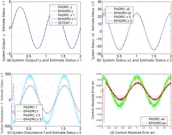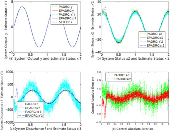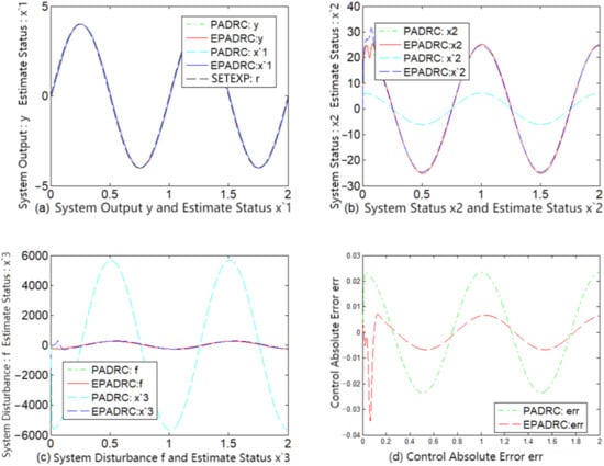 By comparing the subfigures (c) of each of Figure 2, Figure 3, Figure 4, Figure 5, Figure 6 and Figure 7, it may be deduced that EPADRC exhibited a high accuracy in estimating the unknown perturbation tracking, and thus the control error of EPADRC was smaller than that of PADRC.