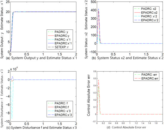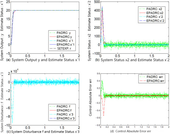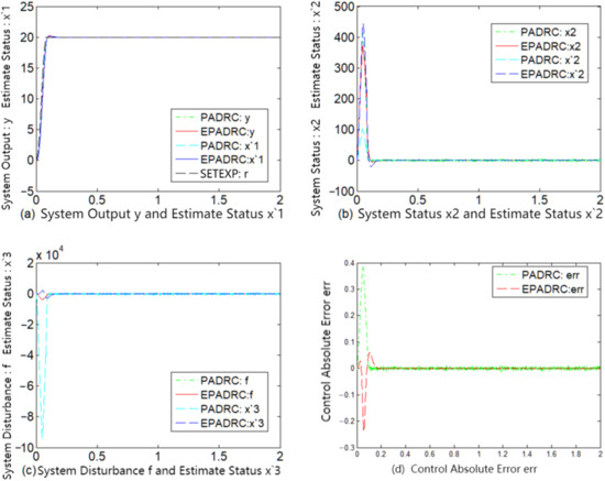 A comparative analysis of the subfigures (d) of each of Figure 2, Figure 3, Figure 4, Figure 5, Figure 6 and Figure 7 indicates that the control accuracy of EPADRC is higher than that of PADRC (except for the initial stage of the controller output, when the peaking phenomenon exists. In the actual project, to avoid the initial peaking phenomenon, the output was set to zero in the initial stage of time, both in terms of dynamic and stable control accuracy). In the initial stage, the control error of EPADRC is large, because the initial value of ESF observer gain is zero, and a short period of time is required it to seek the optimal value. Once the ESF automatically seeks the optimal value of the observer gain, its tracking accuracy greatly improves over time.