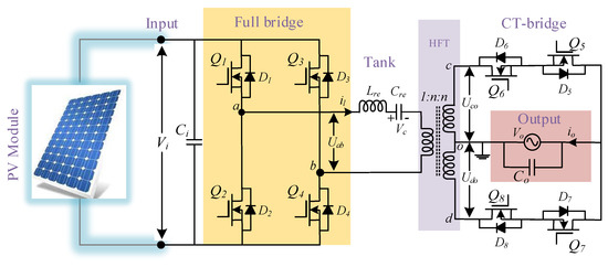 The schematic illustration of the suggested series resonant converter (SRC) is presented in Figure 1. Here it is considered that the PV module generates the maximum power with constant DC. The full bridge on the primary end is comprises four MOSFETs (Q1 to Q4) switches alongside their body diodes (D1 to D4) in an antiparallel manner. The center-tapped (CT) bridge on the secondary side is composed of two limbs, where each limb has two MOSFETs (Q5, Q6, and Q7, Q8) with their body diodes (D5 to D8) in an anti-parallel fashion. The resonant LC tank is cascaded with CT-HFT, and this combination is positioned in between the two bridges. The diodes of the primary end facilitate the backflow of current and hence allow the power to flow in reverse mode. In comparison, the CT bridge does not permit the backflow of current and blocks the reverse current. When both the switches of a limb (Q5, Q6 or Q7, Q8) in the CT bridge are turned off then no current will flow in that limb and vice versa. Similarly, a limb with one conducting switch (i.e., Q5) will only allow the stream of positive current via that limb and the non-conducting switch of the limb will block the flow of negative current (i.e., Q6). The stream of current depends upon the input signal and the direction of power flow can be switched by adjusting the input signals of the MOSFETs.