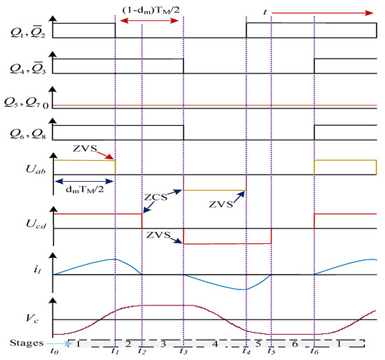 The amplitude of the output current is controlled by the phase shift at the input side of the converter. The MOSFETs of the full bridge will always work in a complementary manner. In Figure 2, the term 1 − dm represents the phase shift ratio between any two complementary switches working at the same instant, where dm is the duty ratio of the output voltage Uab of the input side full bridge. The proposed SRC works into six stages, where stages three and six are named t3 = TM/2 and t6 = TM. These two stages make up half of the operational waveform. Furthermore, stage one and stage four shared similar time interludes and were given as t4 = t1 + TM/2. Likewise, the time breaks of stage two and stage five are equal and are represented as t5 = t2 + TM/2.