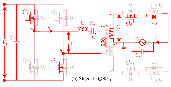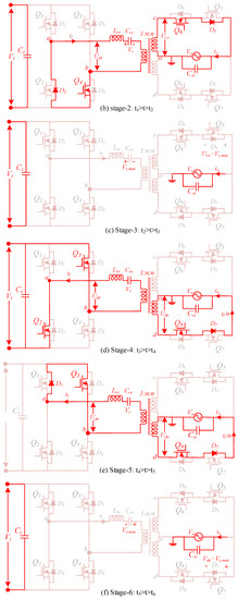 The switches Q1, Q4 of the input side and Q6 of the CT-bridge with antiparallel diode D5 start conducting on ZCS in this stage [t0 < t < t1], as shown in Figure 3a. The total voltage in the resonant circuit at this point is equal to Vi − The il begins to grow up gradually and reaches its highest point as given in Equation (6).