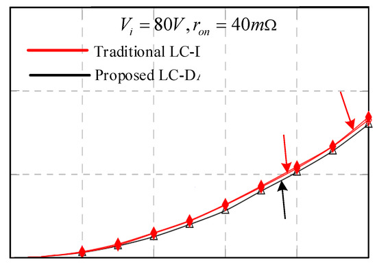 The diagram for switching losses is presented in Figure 6, in which the losses for the proposed converter under FFM are lower than those of the traditional LC-DAB converter. The curves shown in the figure for the proposed converter at two different output voltage values are close to each other with a small gap at higher current values. Whereas in the existing LC-DAB topology, the switching losses increased intensely for lower output values due to a hard switching pattern. In addition, the gap between the two curves is significantly wider at higher current values for the existing LC-DAB converter.