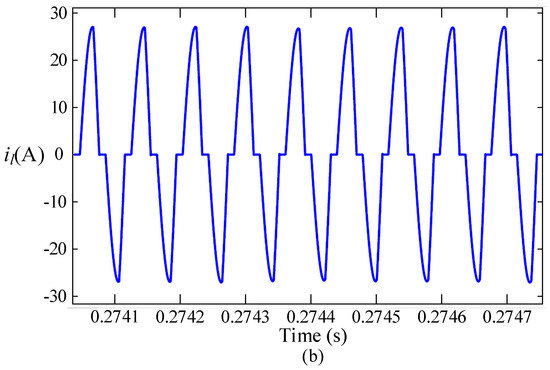 In this part, a Simulink model of the suggested converter was constructed in a MATLAB environment. The model is supposed to be an ideal, where the parasitic resistance is ignored. The results obtained from simulation determine the correctness of the theoretical idea, including blocking of reverse current, calculation of duty cycle and pattern of the gate signal. The tank inductor current il and voltage across the capacitor Vc waveforms at 98% duty ratio are shown in Figure 8. The zoom-in plots of the il having three levels are presented in Figure 9b, where the harmonics content is mitigated in il and this is achieved by using the capacitor in the tank circuit, as shown in Figure 9a. In Figure 9b, the charging and discharging of il can be observed, which happens according to the boundary conditions discussed in Section 2.