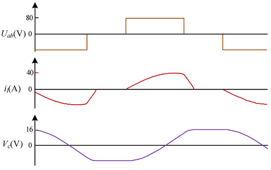The waveforms of the output voltage of the full bridge Uab, inductor current il, and capacitor voltage Vc across the tank are presented at 0.15 duty cycle (Vi = 80 V and Vo = 50 V) in Figure 10. The duty cycle is raised to 0.7 (Vo = 160 V) in Figure 11. In both figures, the current returns and stays at zero until the beginning of a new switching mode, which operates in discontinuous conduction mode (DCM). The results support the precise anticipation of current and voltage in Section 2 and Section 3, whereas the boundary conditions are achieved at the derived turns ratio and the resonance frequency. In both cases, the output current io is fixed at Figure 9a.